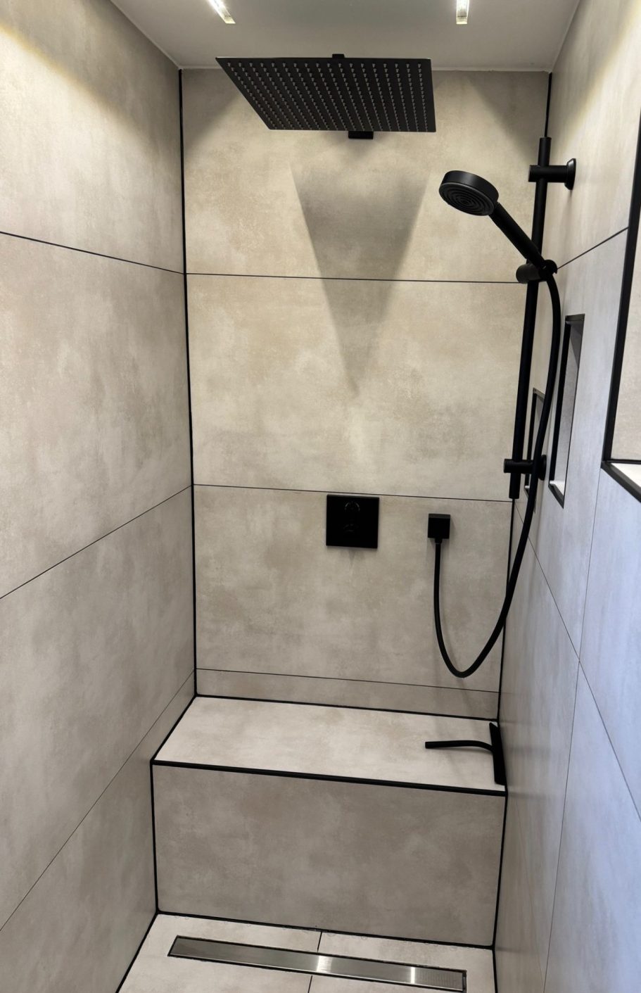 Eleganter Duschbereich mit schwarzem Farbkonzept,kombiniert mit stilvollen Leisten,passender Silikonfugen in Fugenfarbe und hochwertigen schwarzen Armaturen. Ein zeitloses Design mit Liebe zum Detail.
